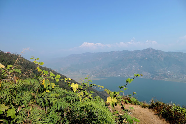 Päivän kierros alkoi näköalapaikalta World Peace Pagodan läheltä, josta kirkkaalla säällä olisi nähnyt Phewa järven yli Himalajalle. Hyvällä mielikuvituksella "kalan häntä" näkyy kuvissa. Videonpätkä täältäkin muistona. Kuljimme jalkaisin polkua alaspäin napsien kuvia ympäristöstä.