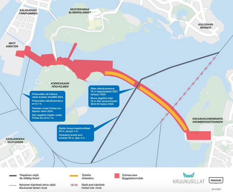 Katajanokan rannassa seisovat komeat jäänmurtjat nähtiin samalla kun alitettiin Finkensilta Nihdin ja Korkeasaaren välillä. Se on osa Kruunuvuorensiltoja ja seuraavana nähtiinkin valmistumassa oleva Kruunuvuorenselän ylittävä Suomen pisin silta ja sen keskelle rakentuva 135 metriä korkea pyloni. Siltatyömaan nettisivuilta löytyi myös havainnekuva valmiista sillasta.