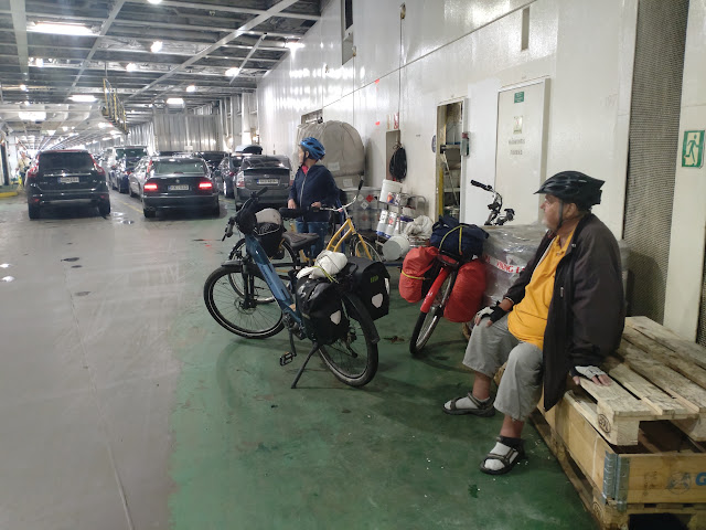 Tällä matkalla sekä moottoripyöräilijät että polkupyöräilijät olivat laivan autokannen peräosassa. Tavallisesti saamme kiinnittää pyörämme kuminauhoilla laivan seinässä oleviin tankoihin tms. mutta nyt meitä ohjeistettiin laittamaan pyörät kallelleen seinän vieressä olevia tavaralavoja vasten. Hyvin ne olivat pysyneet merimatkan ajan paikoillaan niinkin.